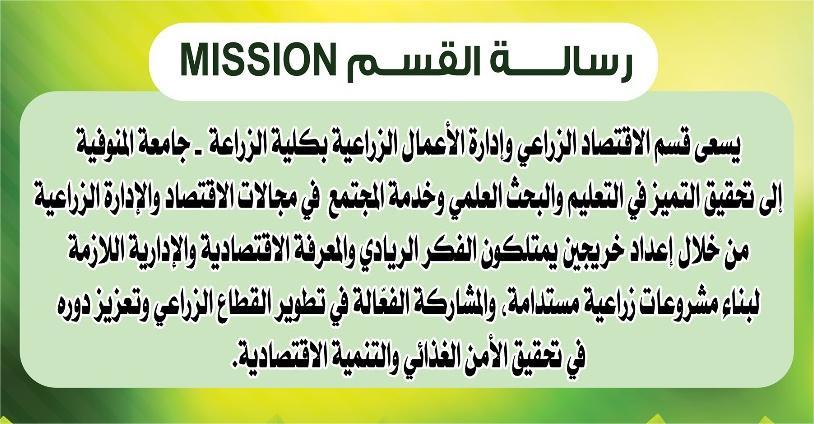 يسعى قسم الاقتصاد الزراعي بكلية الزراعة جامعة المنوفية إلى دعم وتشجيع البحوث والمشروعات المرتبطة بمجال الاقتصاد والتي تحقق احتياجات المجتمع من خلال وضع برامج دراسية لطلاب مرحلة البكالوريوس والدراسات العليا في مجال الاقتصاد الزراعي .