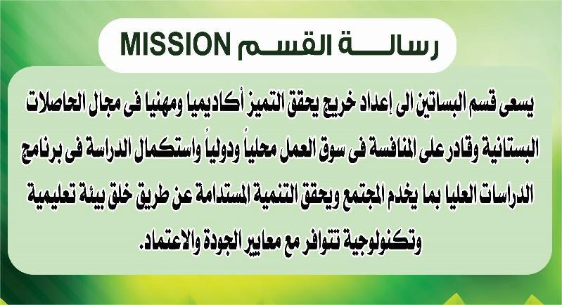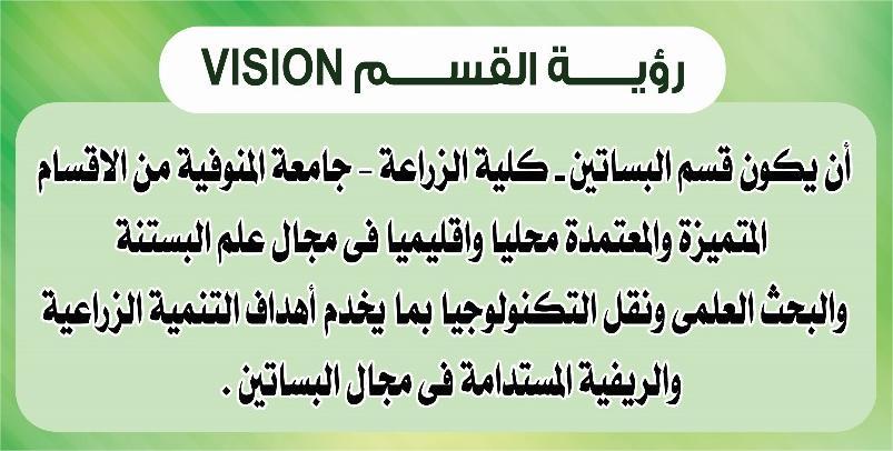أن يكون قسم البساتين بكلية الزراعة – جامعة المنوفية له دورفعال في مجال البساتين من الناحية الأكاديمية والتطبيقية ويحقق للخريجين أعلى المستويات الفكرية والمهارية للتنافس محليا وعالميا في مجال تخصصه