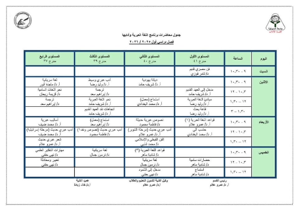 1_ الجدول الدراسى للترم الأول للعام الجامعى 2026/2025