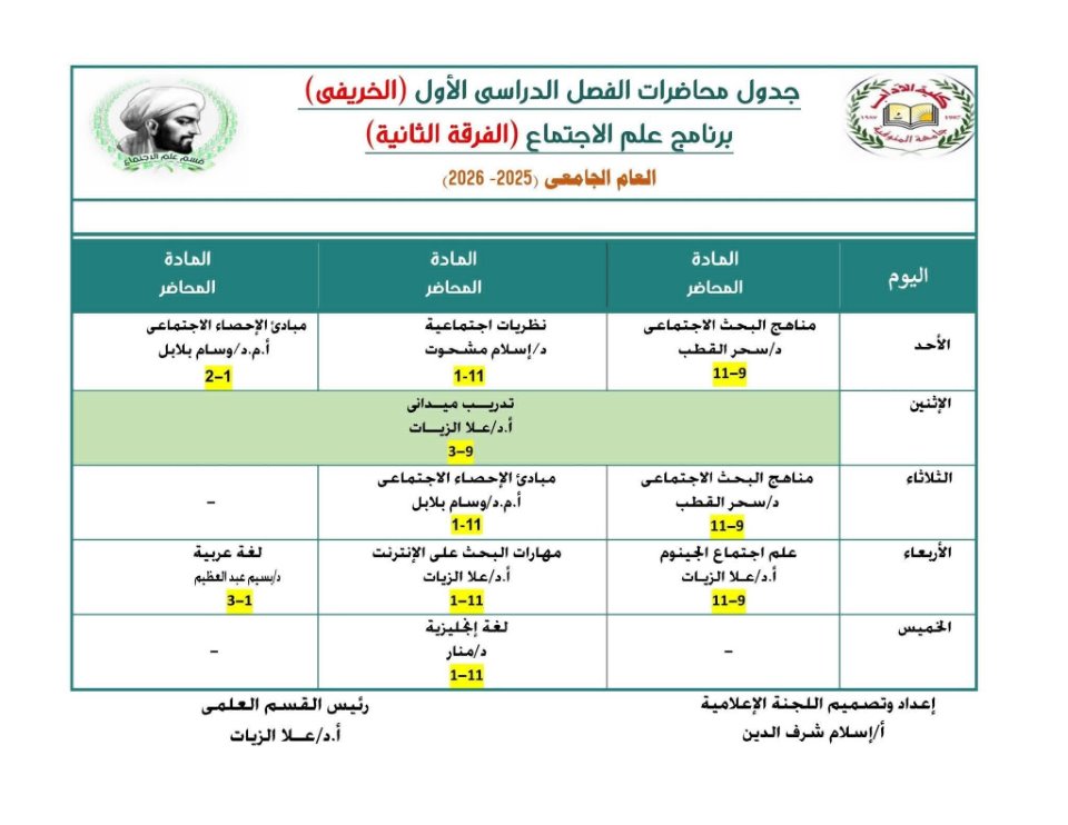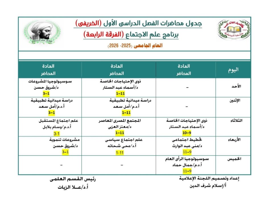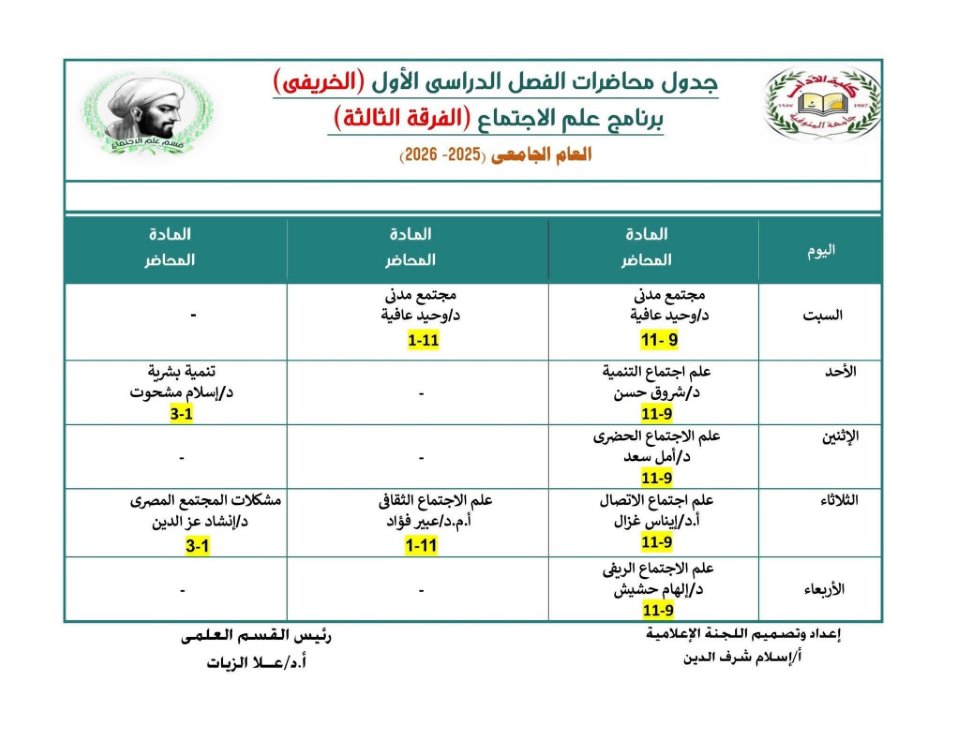1_ الجدول الدراسى للفصل الدراسى الأول للعام الجامعى 2026/2025