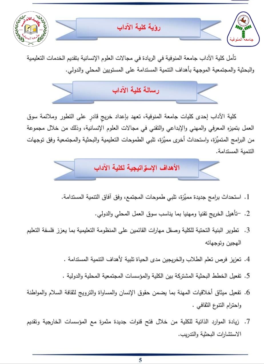 كلية الآداب أحدى كليات جامعة المنوفية , تعهد بإعداد خريج قادر على التطور وملاءمة سوق العمل بتميزه المعرفى والمهنى والإبداعى والتقنى فى مجالات العوم الإنسانية , وذلك من خلال مجموعة من البرامج المتميزة واستحداث أخرى مميزة , تلبى طموحات المنظومة التعليمية والبحثية والمجتمعية وفق