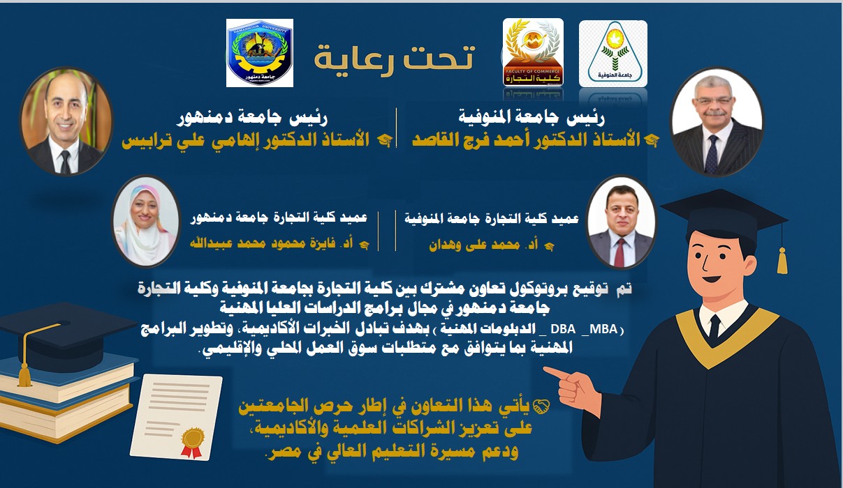 توقيع بروتوكول تعاون بين كلية التجارة – جامعة المنوفية ونقابة الصيادلة بالمنوفية،وذلك في مجال الدراسات العليا المهنية.