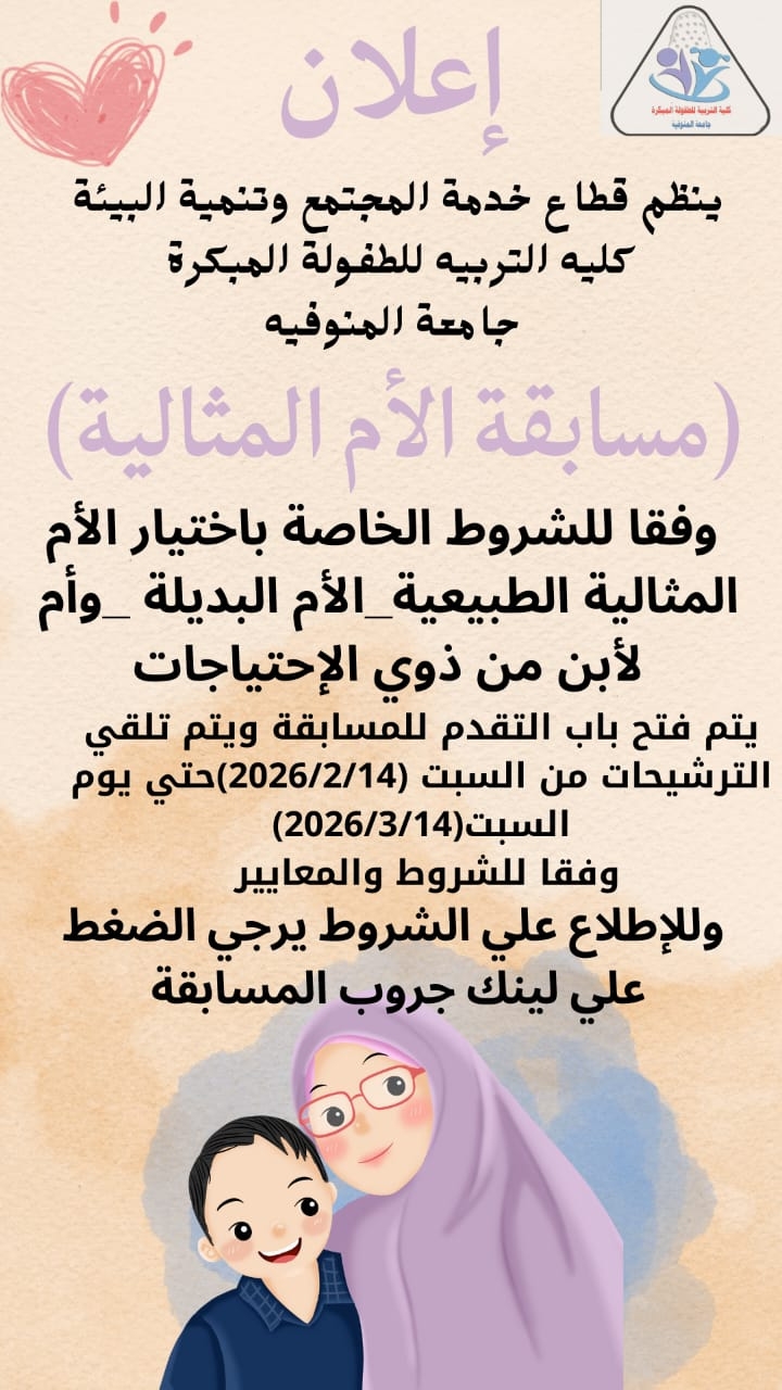تعلن الكلية عن تنظيم مسابقة الأم المثالية، وذلك في إطار دور الكلية في خدمة المجتمع ودعم النماذج الإيجابية من الأمهات.