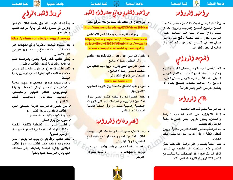 تمنح جامعة المنوفية بناءا على طلب مجلس كلية الهندسة بشبين الكوم الدرجات العلمية التالية لمرحلة الدراسات العليا في الهندسة بنظام الساعات المعتمدة