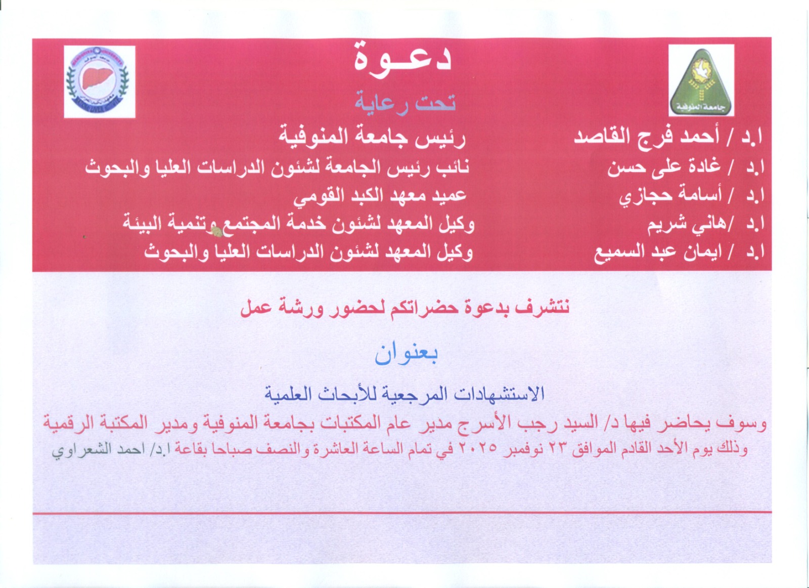 نظم معهد الكبد القومي بجامعة المنوفية ورشة عمل متقدمة بعنوان "الاستشهادات المرجعية للأبحاث العلمية"، وذلك في إطار جهود ا