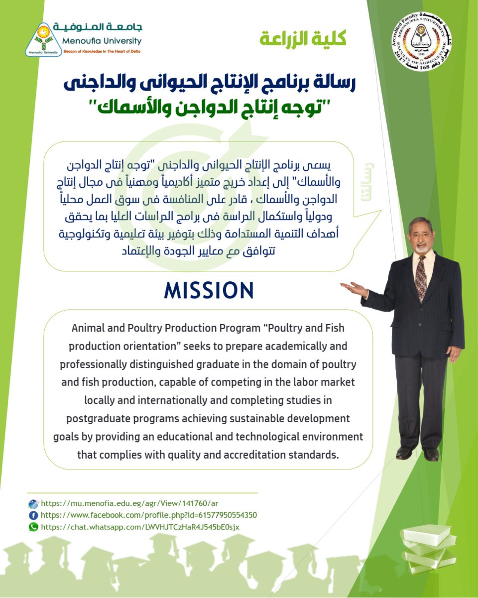 يسعى برنامج الإنتاج الحيوانى والداجنى توجه إنتاج الدواجن والأسماك إلى إعداد خريج متميز أكاديميا ومهنيا فى مجال إنتاج الدواجن والأسماك قادر على المنافسة فى سوق العمل محليا ودوليا, وإستكمال الدراسة فى برامج الدراسات العليا بما يحقق أهداف التنمية المستدامة بتوفير بيئة تعليمية وتكنولوجية تتوافق مع معايير الجودة والإعتماد