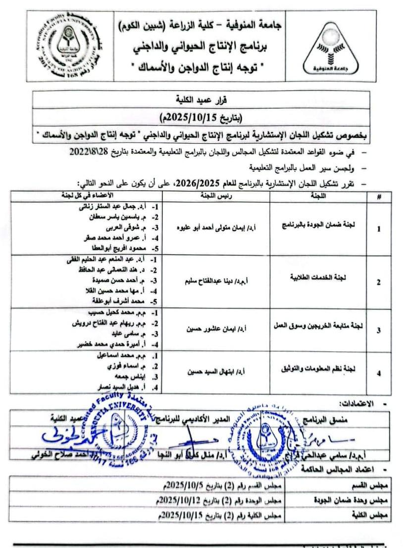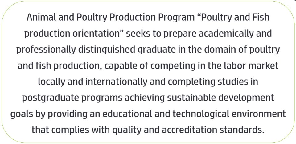 -Demonstrate his skills in managing various poultry and fish facilities (fattening, laying, mothers, grandparents, rabbits, slaughterhouses, hatcheries and feed factories) in order to preserve his surrounding environment and be an employee of the available natural resources.