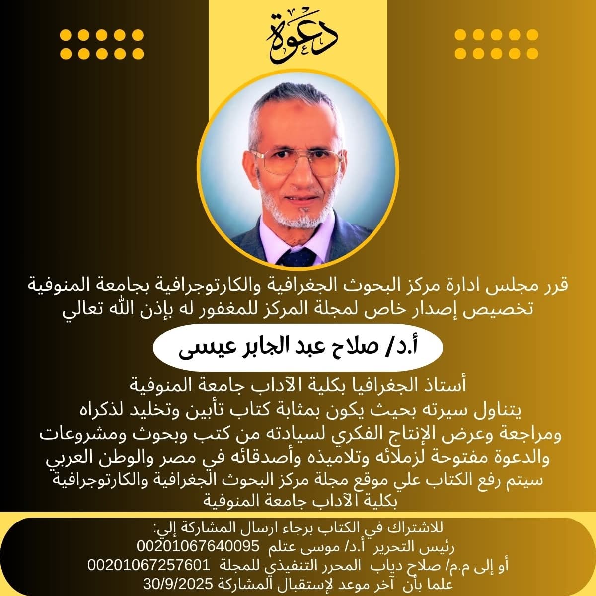 قرر مجلس ادارة مركز البحوث الجغرافية والكارتوجرافية بجامعة المنوفية تخصيص إصدار خاص لمجلة المركز للمغفور له بإذن الله تعالي أ.د/ صلاح عبد الجابر عيسى أستاذ الجغرافيا بكلية الآداب جامعة المنوفية تحت عنوان سيرة ومسيرة أ.د/ صلاح عيسى يتناول سيرته بحيث يكون بمثابة كتاب تأبين وتخليد لذكراه ومراجعة وعرض الإنتاج الفكري لسيادته من كتب وبحوث ومشروعات... والدعوة مفتوحة لزملائه وتلاميذه وأصدقائه في مصر والوطن العربي