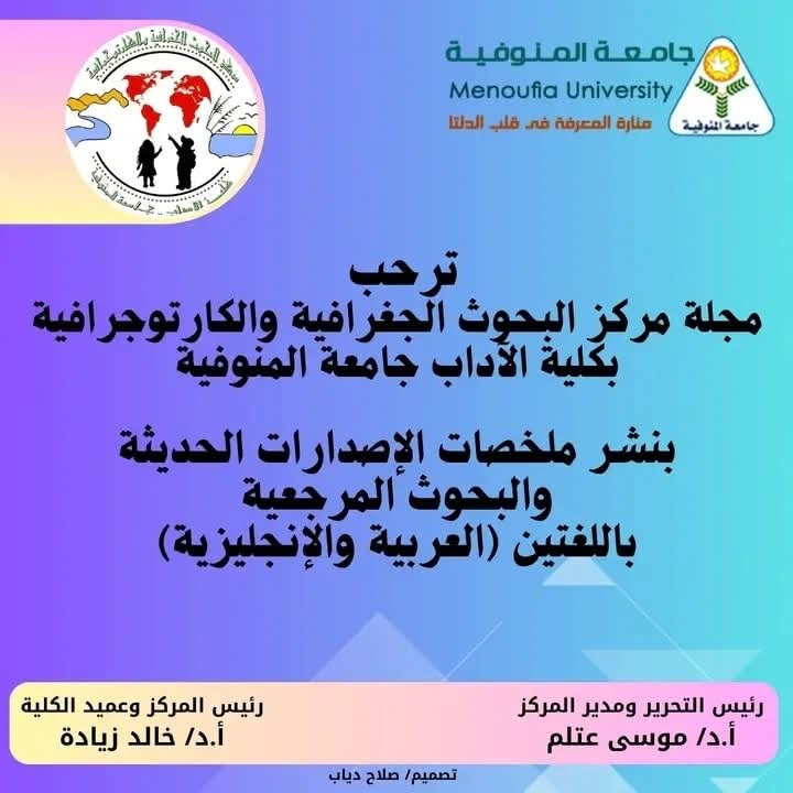 ترحب مجلة مركز البحوث الجغرافية والكارتوجرافية بكلية الآداب جامعة المنوفية، بنشر ملخصات الإصدارات الحديثة والبحوث المرجعية باللغتين (العربية والإنجليزية)