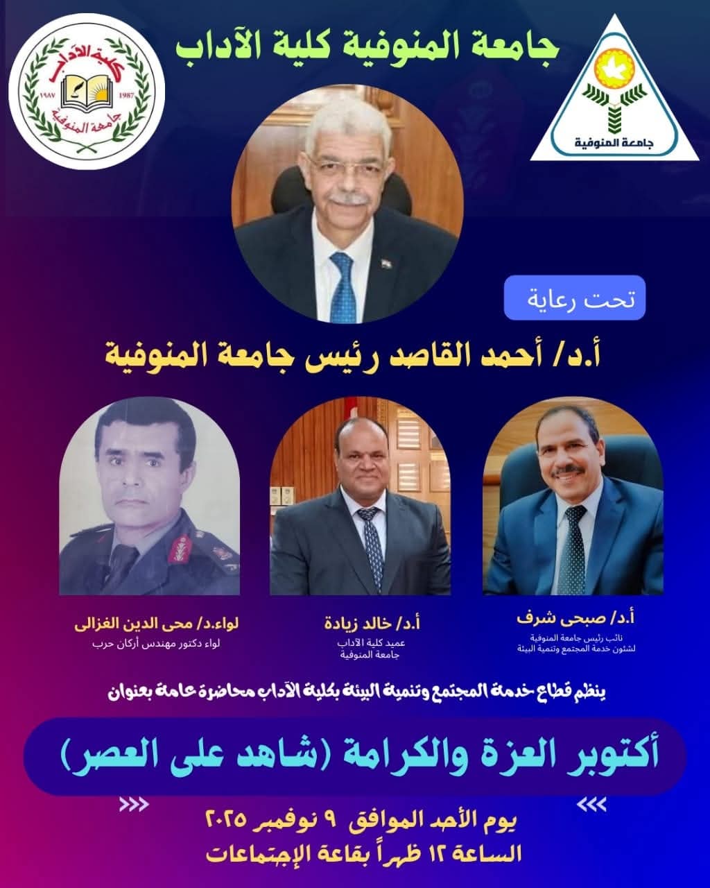ينظم قطاع خدمة المجتمع وتنمية البيئة بكلية الآداب محاضرة عامة بعنوان " أكتوبر العزة والكرامة ( شاهد على العصر )، يحاضر فيها لواء دكتور مهندس أركان حرب/ محى الدين الغزالى.