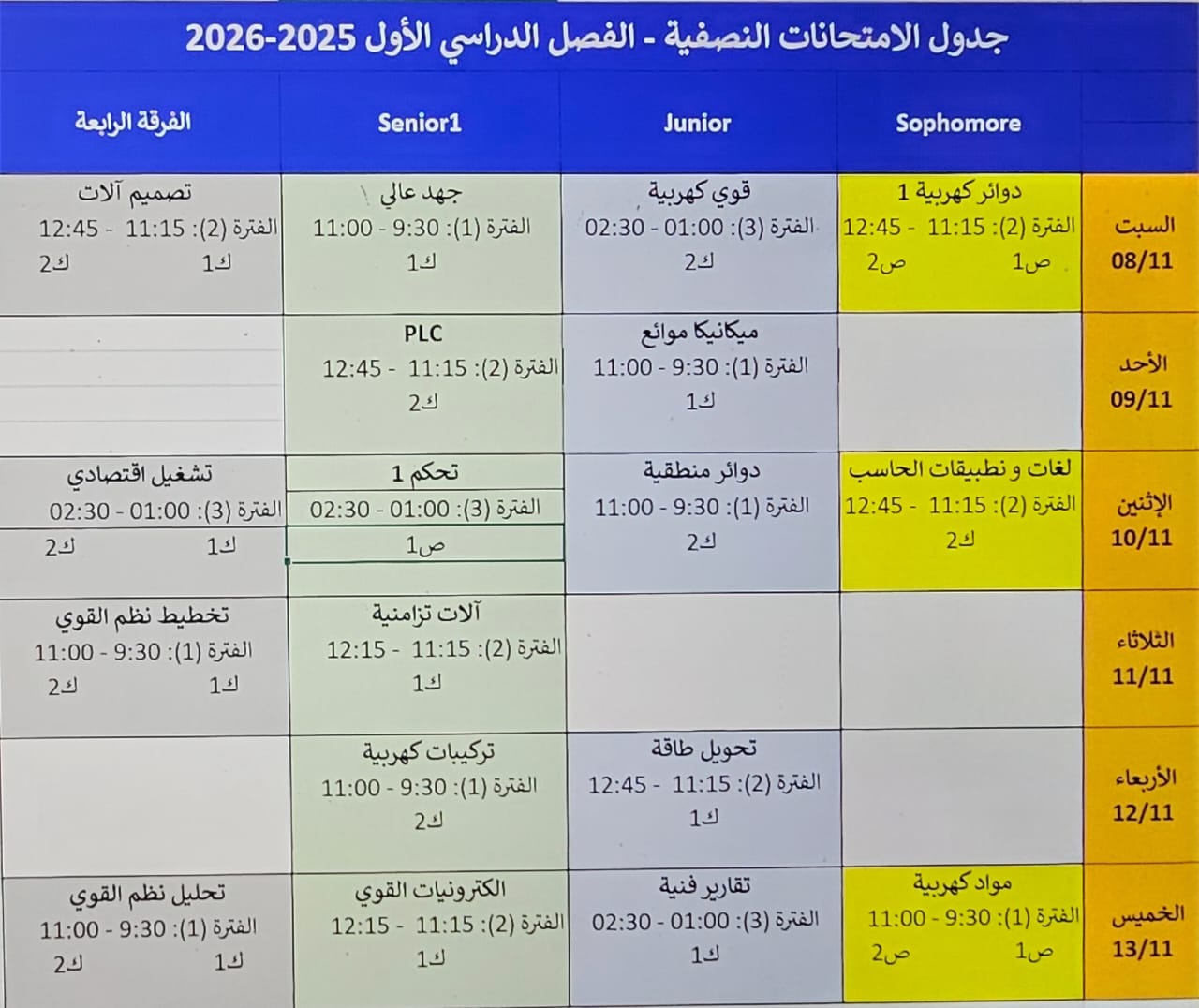 جدول امتحانات منتصف الفصل الدراسي الاول للعام الجامعي 2025\2026