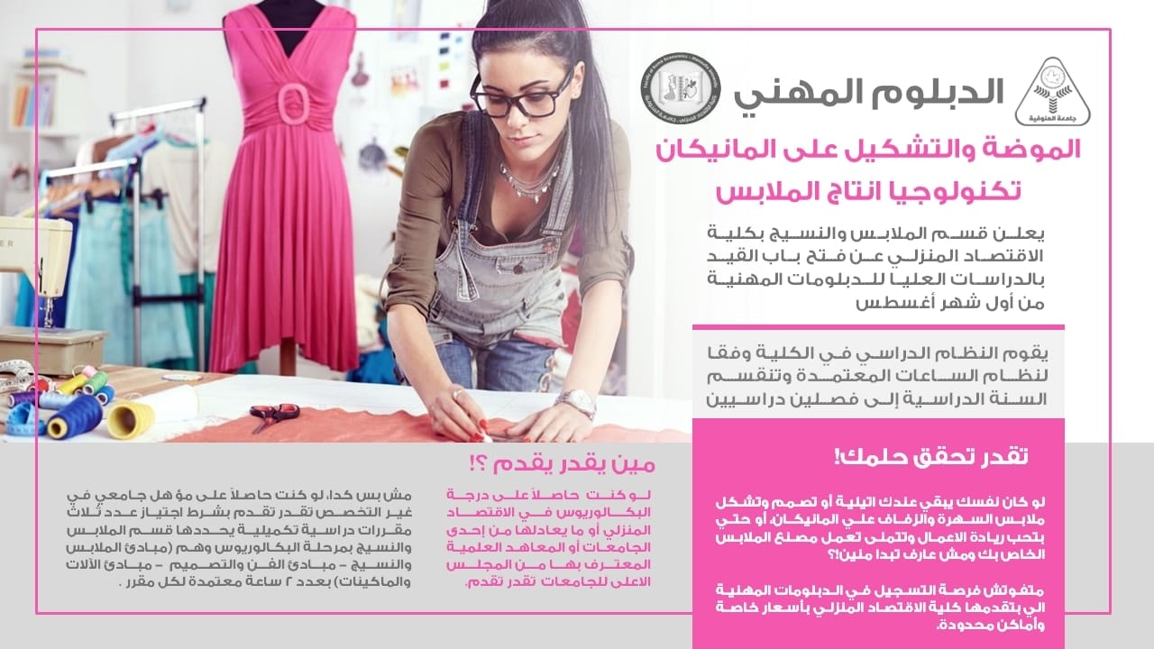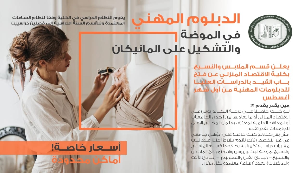 تعلن كلية الاقتصاد المنزلي – جامعة المنوفية عن فتح باب القيد بالدبلومات المهنية للعام الجامعي 2025/2026 للحاصلين على البكالوريوس او الليسانس بـ قسم الملابس والنسيج