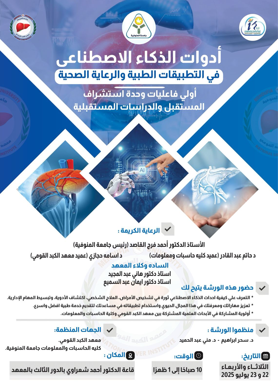 شهد معهد الكبد القومي بجامعة المنوفية انطلاق ورشة عمل نوعية ومكثفة بعنوان "الذكاء الاصطناعي ودوره في البحث العلمي وتحسين