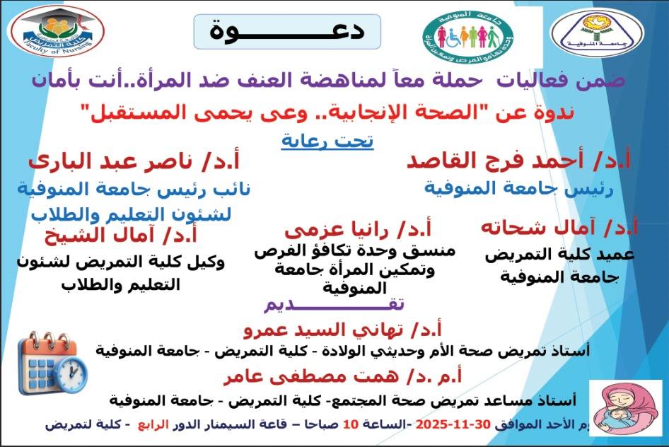 في إطار فعاليات حملة "معًا لمناهضة العنف ضد المرأة ستقام ندوة عن الصحة الانجابيه.وعيى يحمي المس