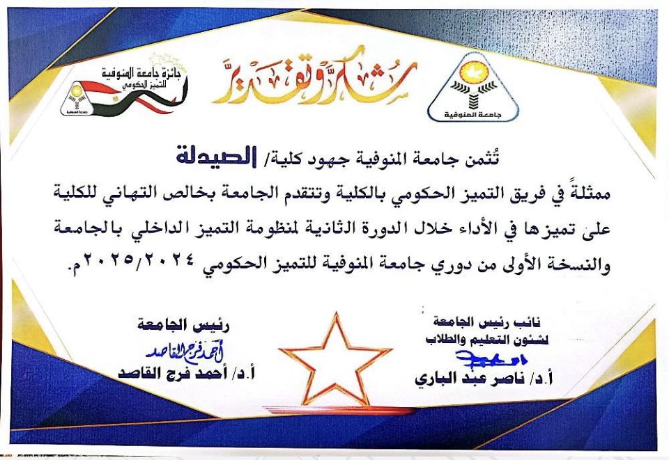 وقد تسلّم الأستاذ الدكتور هيثم ميمون عباس عميد كلية الصيدلة، والدكتورة شيماء مجدي منسق التميز الحكومي بالكلية، شهادة تقدير من رئيس الجامعة تقديرًا لجهود الكلية وفريقها المتميز في تطبيق معايير التميز المؤسسي والتحول الرقمي، وحرصها على مواكبة رؤية مصر 2030 في مجالات التطوير والجودة والابتكار في الأداء الأكاديمي والإداري.
