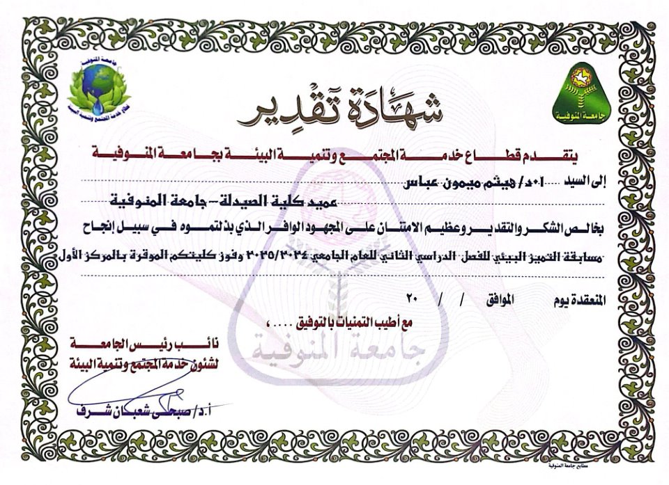 من جانبه، أعرب الأستاذ الدكتور هيثم ميمون عباس، عميد كلية الصيدلة، عن اعتزازه بهذا الإنجاز، موجّهًا الشكر لأعضاء هيئة التدريس والعاملين والطلاب على ما بذلوه من جهود مخلصة أدت إلى هذا التميز المستحق، مؤكدًا أن الكلية تولي اهتمامًا خاصًا بالجانب البيئي وتحرص على غرس قيم الانتماء والمسؤولية المجتمعية في نفوس طلابها.