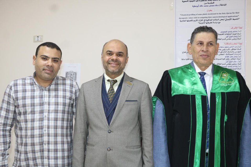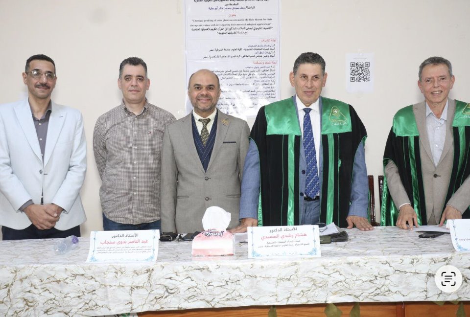 تناولت رسالة الباحثة دعاء مجدي محمد خالد أبو عطية موضوعًا مهمًا بعنوان “التنميط الكيميائي لبعض النباتات المذكورة في القرآن الكريم وتطبيقاتها النانونية”، حيث أسهمت توجيهات د. سنجاب ورؤاه العلمية الدقيقة في إثراء الحوار وتعميق النقاش حول الرسالة.