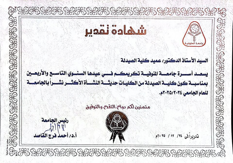 وقد صدر هذا التكريم بتوقيع الأستاذ الدكتور أحمد فرج القاصد، رئيس الجامعة، تأكيدًا على تقدير الجامعة للجهود المخلصة والإنجازات المستحقة، واستمرارًا لمسيرة التميز والعطاء التي تنتهجها الجامعة في عيدها السنوي التاسع والأربعين.