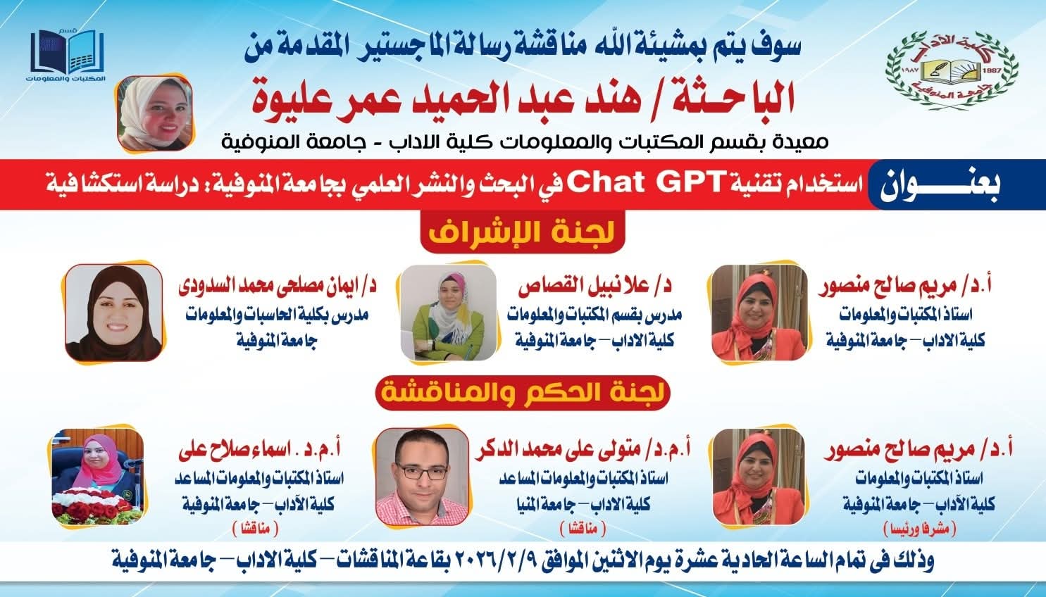 شهد قسم المكتبات والمعلومات بكلية الآداب – جامعة المنوفية انعقاد السيمنار العلمي الأول للعام الجامعي ، حيث تم خلاله عرض خطتين بحثيتين لمرحلة الماجستير، إلى جانب مناقشة فكرة بحث دكتوراه تناولت موضوعات بحثية متميزة في مجال المكتبات والمعلومات.