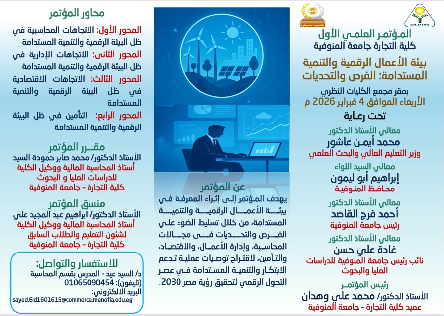 المؤتمرات إعلان تعلن كلية التجارة – جامعة المنوفية عن عقد المؤتمر العلمي الأول بعنوان: "بيئة الأعمال الرقمية والتنمية المستدامة: الفرص والتحديات" والمقرر عقده يوم الاربعاء الموافق 4 فبراير 2026 Share