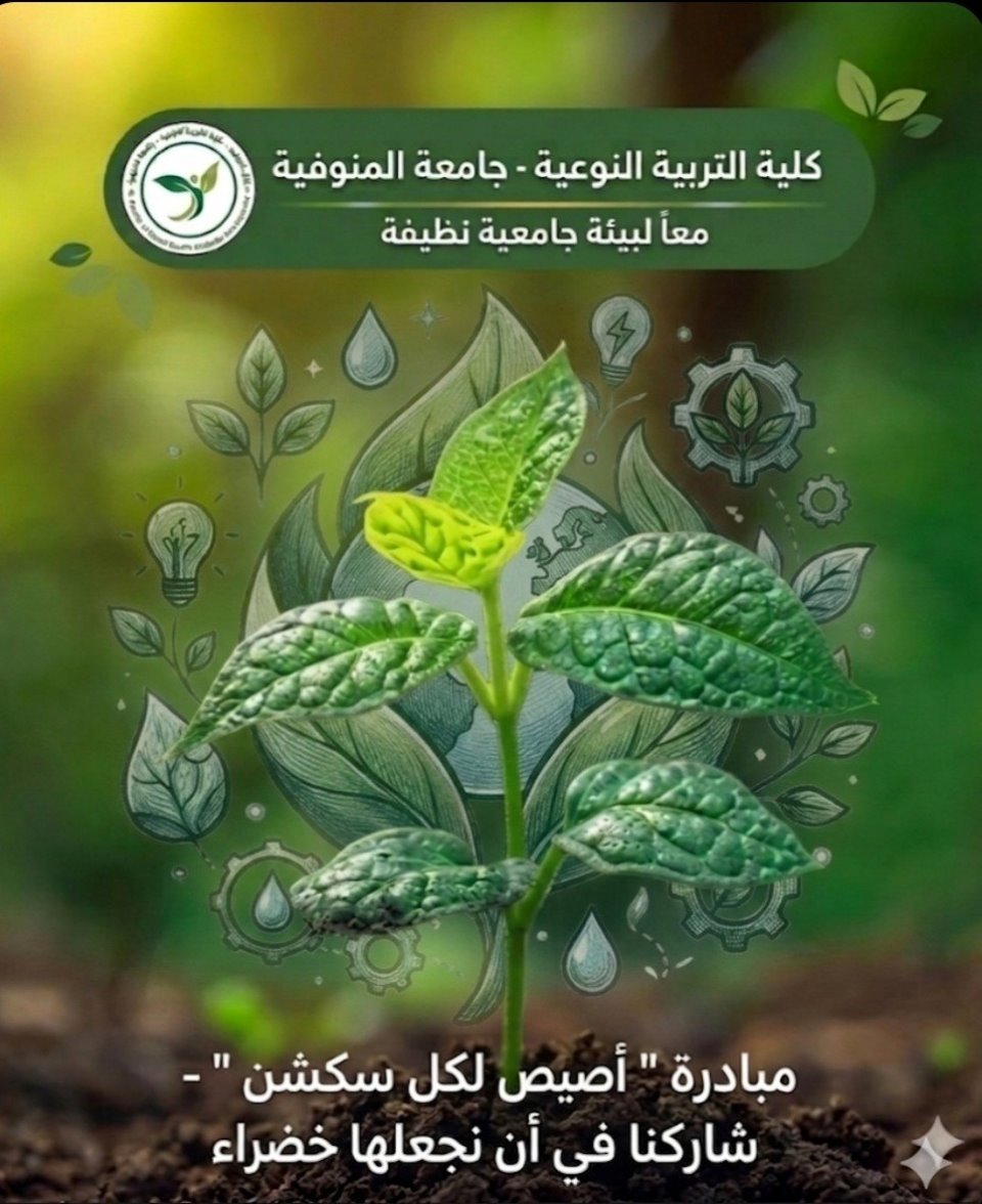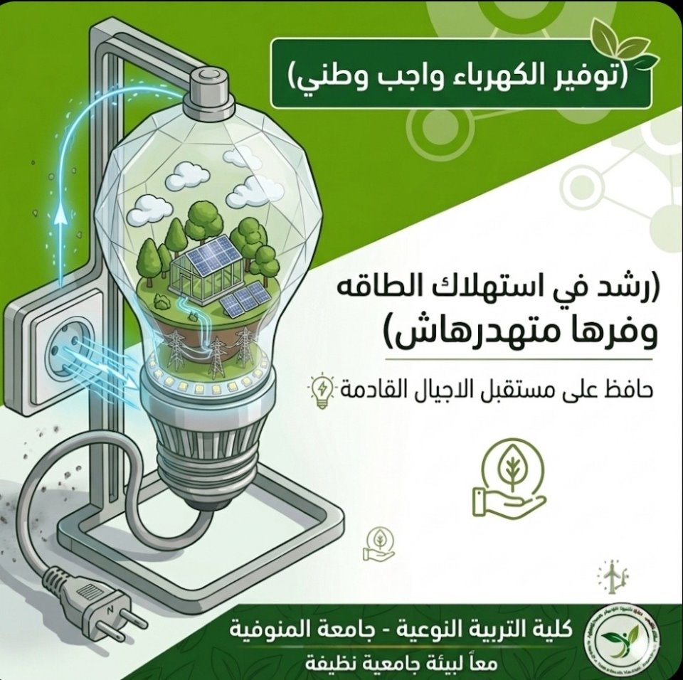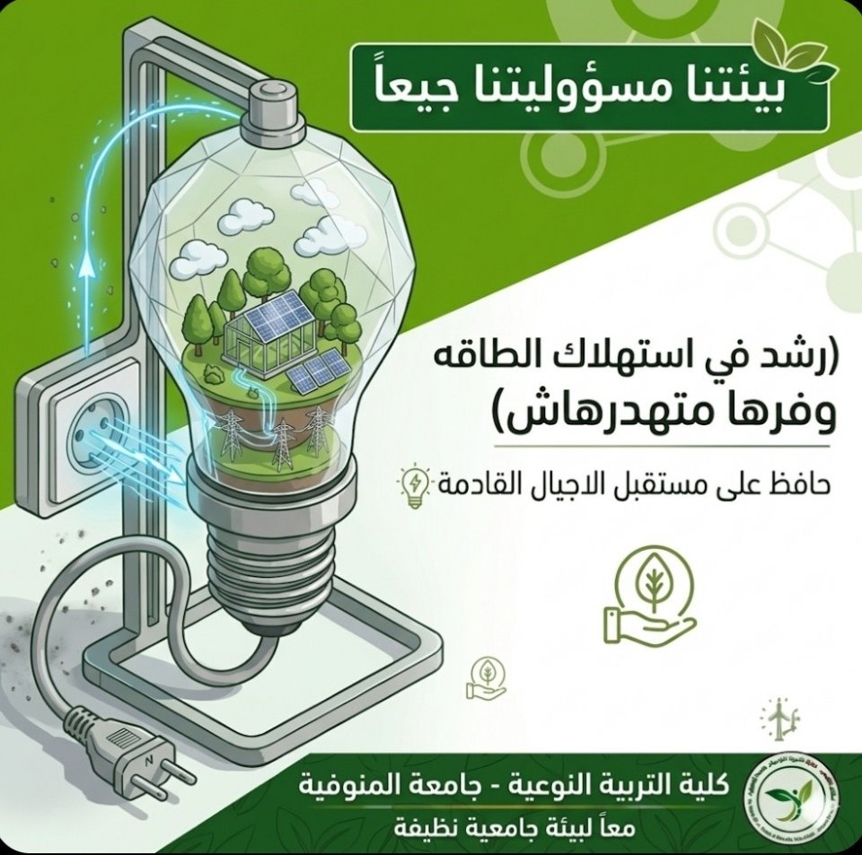 من 15/04/2026 إلي 30/06/2026 المكتب الأخضر بالنوعية يعلن عن مجموعة من التعليمات والإرشادات لتعزيز الاستدامة البيئية من خلال ترشيد استهلاك الطاقة والمياه، نشر الوعي البيئي.