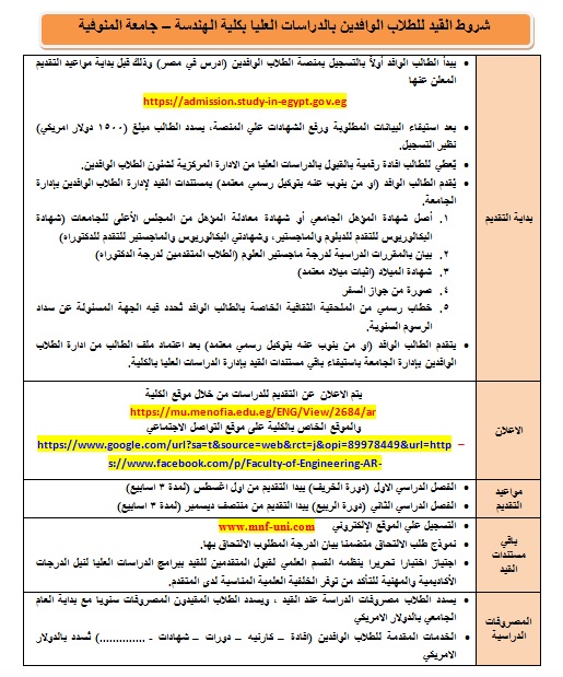 أن يكون الطالب حاصلاً على درجة بكالوريوس الهندسة فى تخصص مناسب لنوع الدراسة المتقدم لها الطالب من إحدى الجامعات المصرية أو أى درجة معادلة لها من معهد علمي أخر معترف به من المجلس الأعلى للجامعات