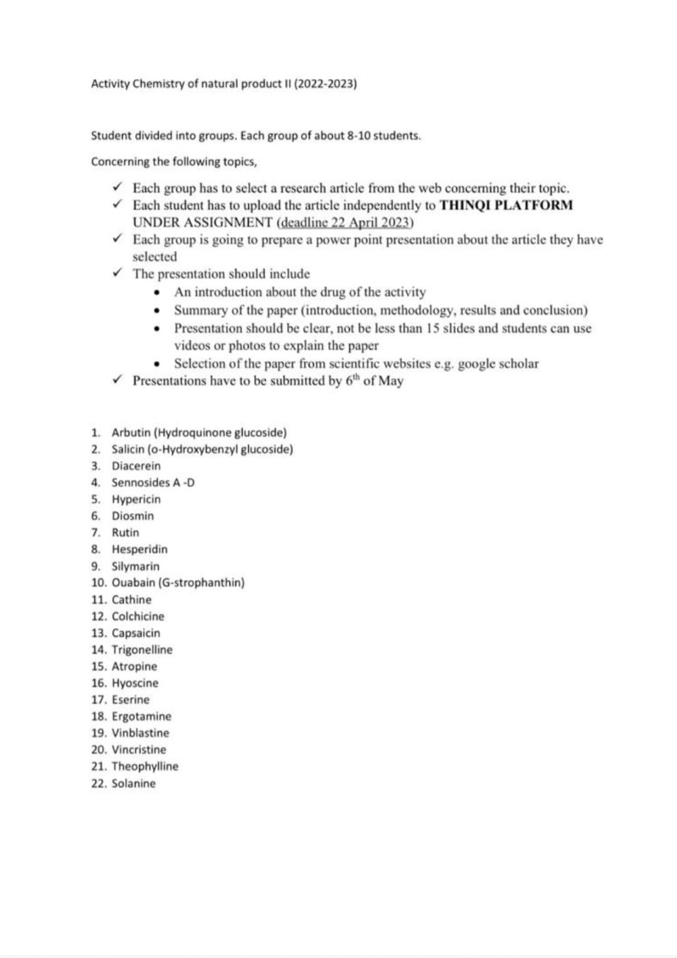 تم تقسيم الطلاب الي مجموعات بحيث حيث قاموا بتجميع بعض الأدويه من السوق والتي تحتوي علي منتجات طبيعيه وتم دراستها من خلال المنهج الدراسي وتم رفعها علي المنصه في شكل أبحاث.